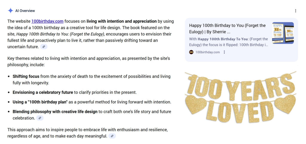 The book takes a unique approach to intentional living by using planning your 100th birthday party as a tool for examining how you want to live your life right now. The core philosophy is: